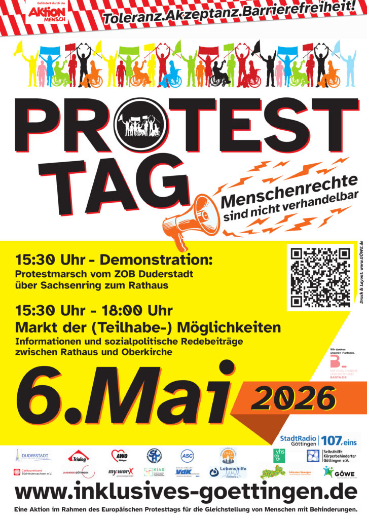Unter dem Motto „Toleranz. Akzeptanz. Barrierefreiheit.“ findet am 6. Mai 2026 der Protesttag für Menschen mit Behinderung in Duderstadt statt. Auch wir sind mit einem eigenen Stand vertreten und setzen gemeinsam mit vielen weiteren Organisationen ein klares Zeichen für mehr Inklusion und gesellschaftliche Teilhabe.
